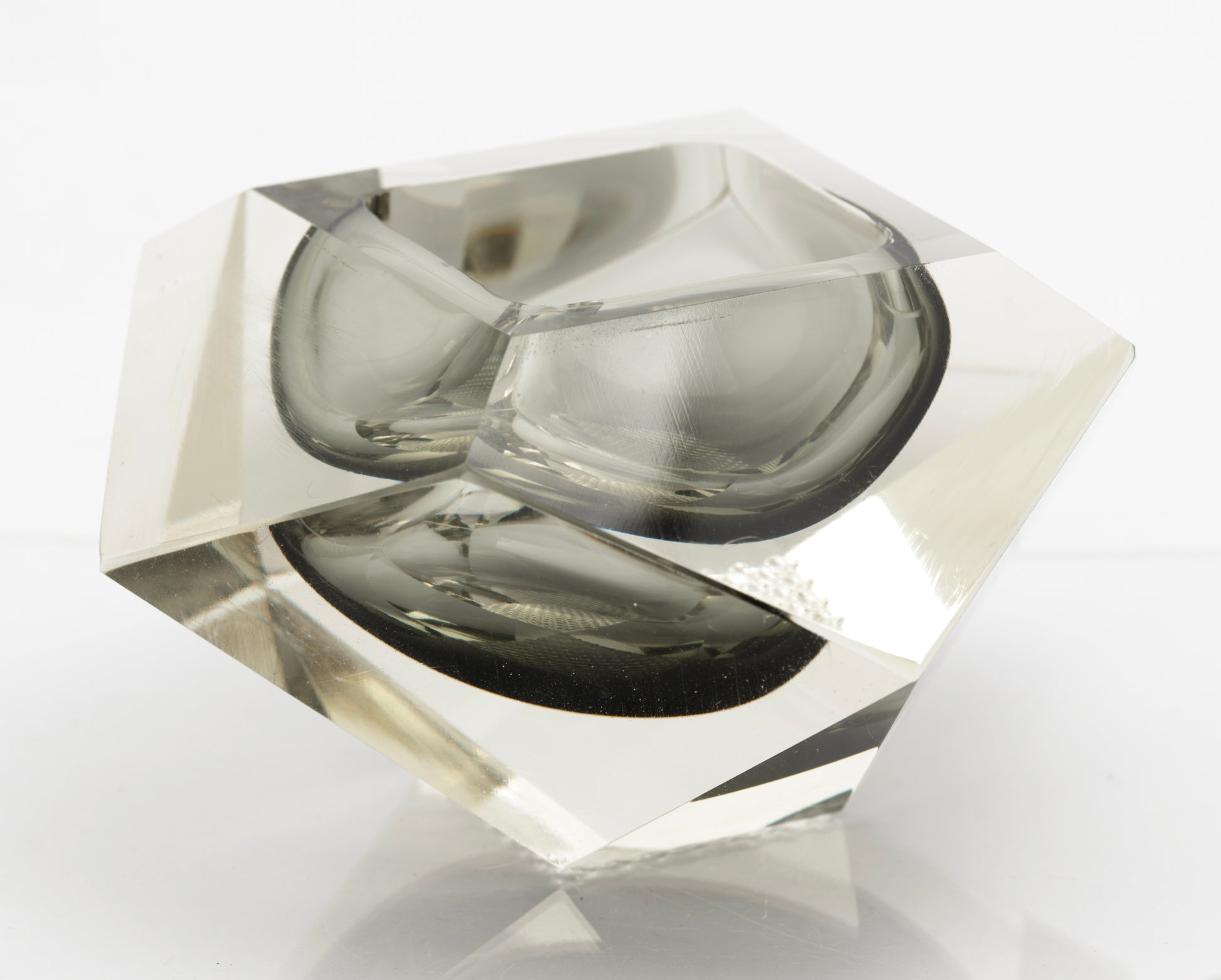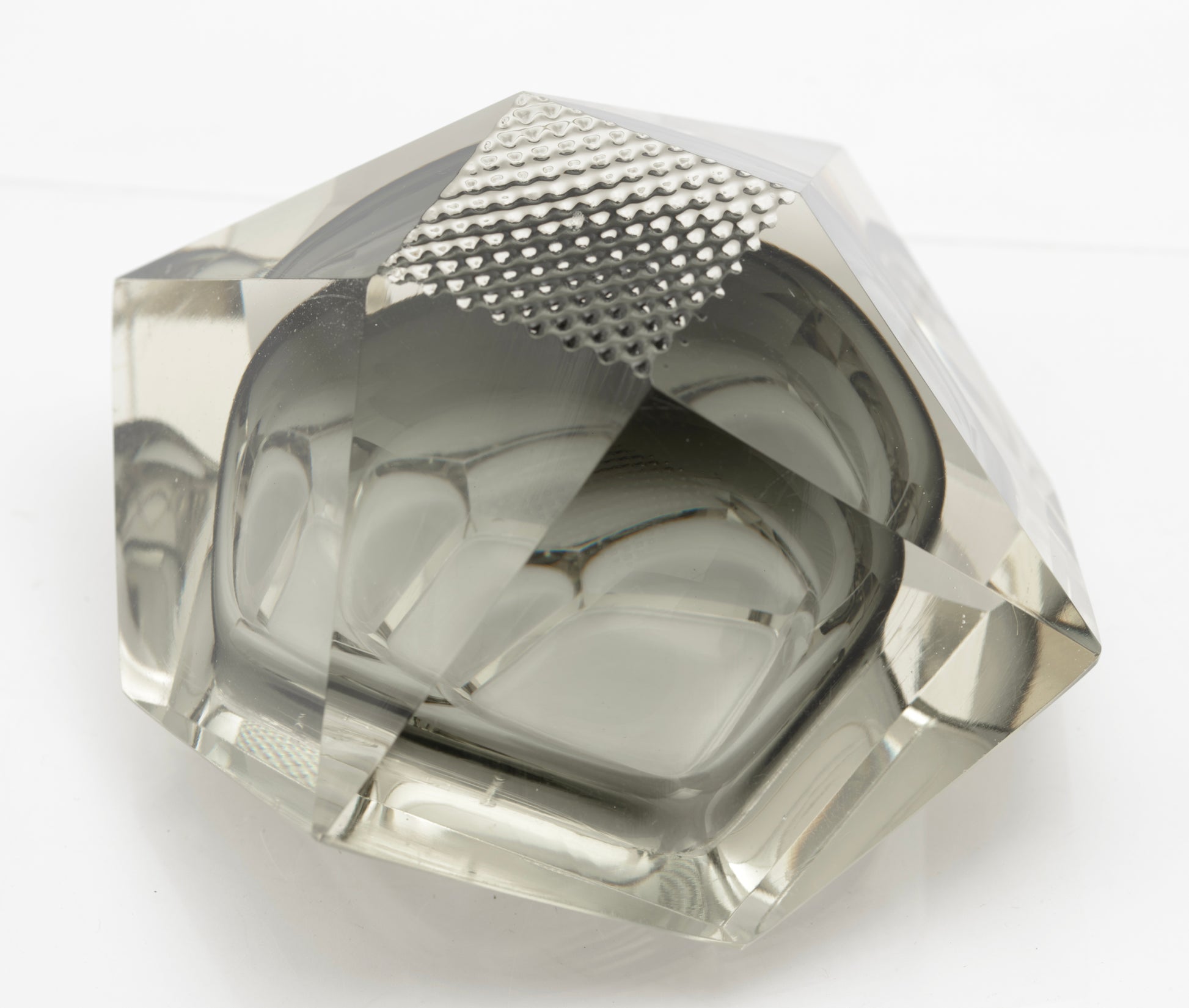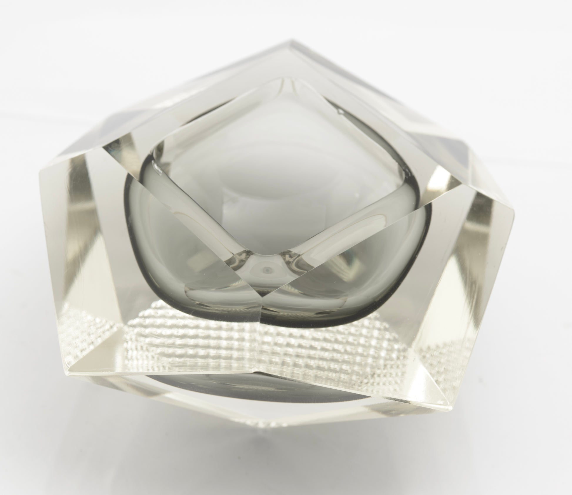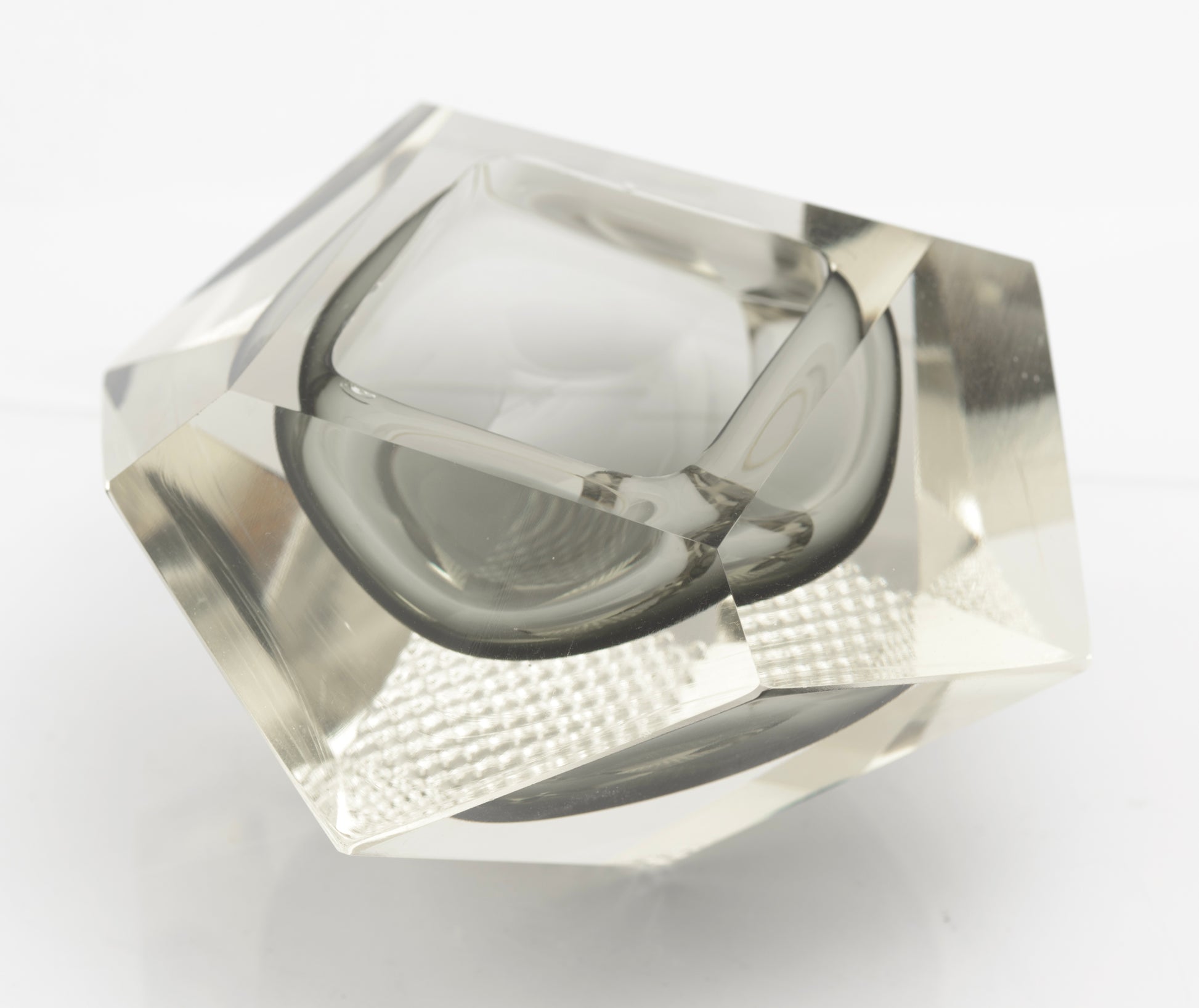 A vintage Murano art glass geode bowl in the manner of Mandruzzato. It is a sommerso glass example with clear outer glass and a pewter toned interior. It has a textured base which reflects throughout the bowl when viewed head on. There are no makers marks which is normal as these items usually came with paper sticker. It would date to the 1960's.