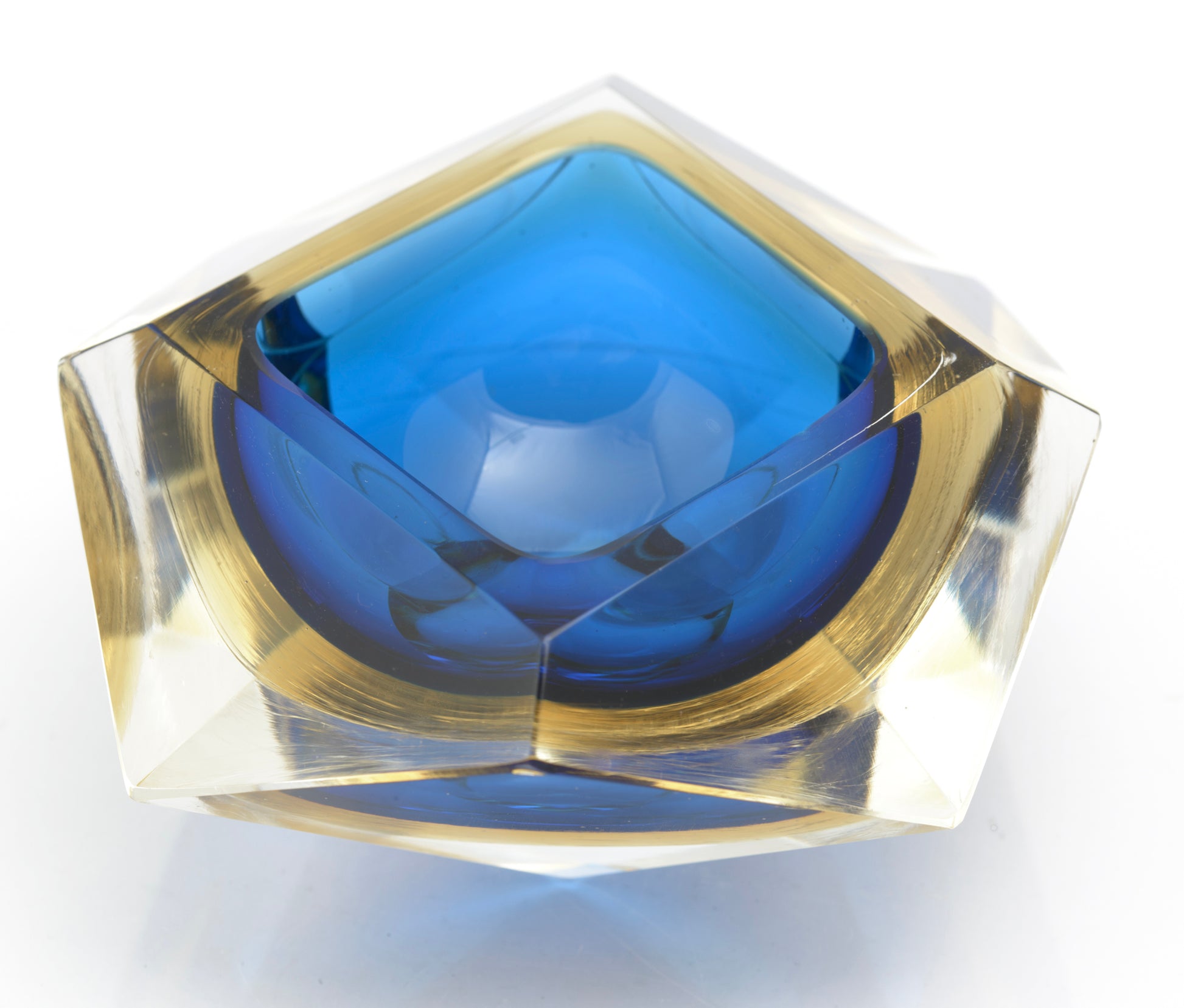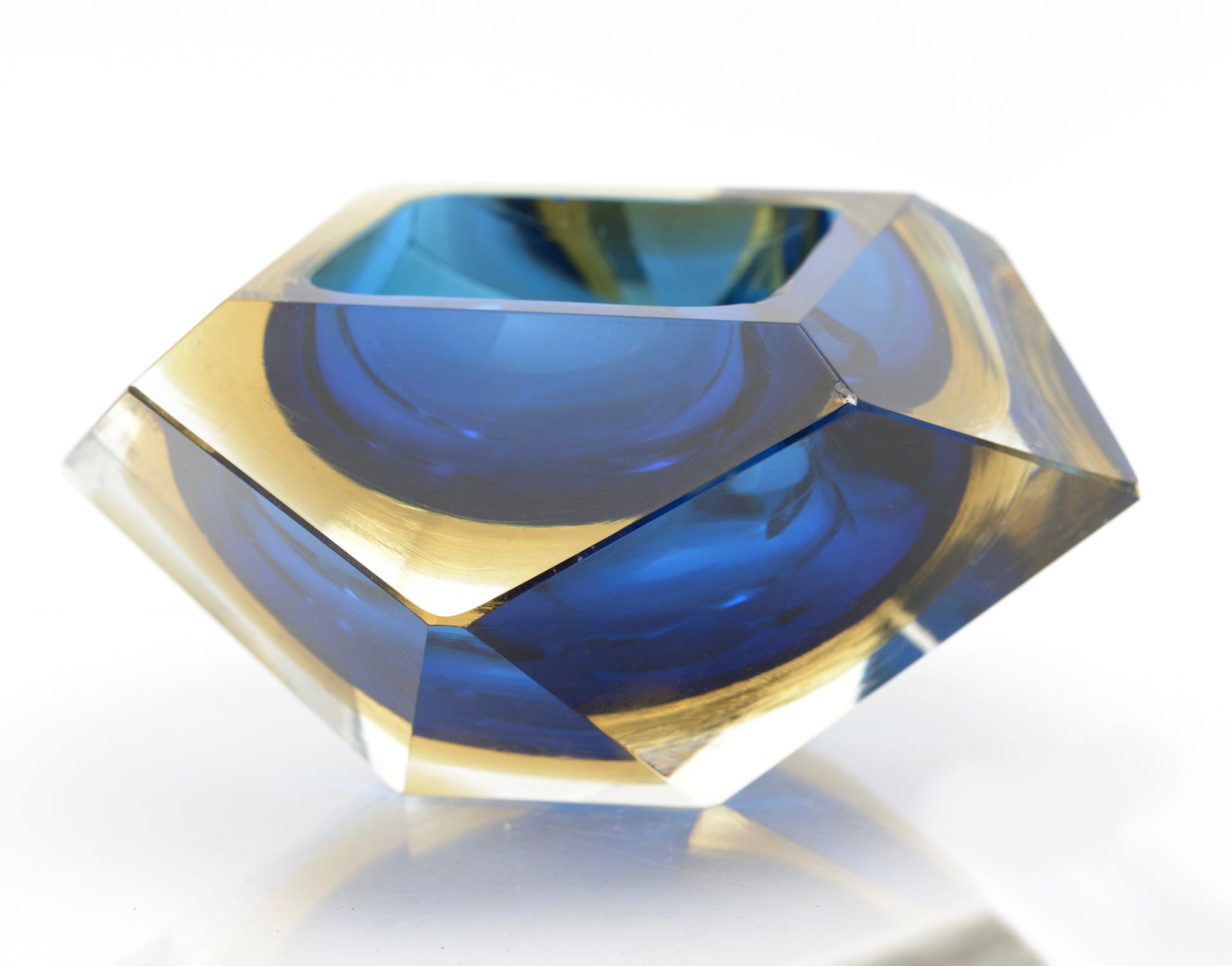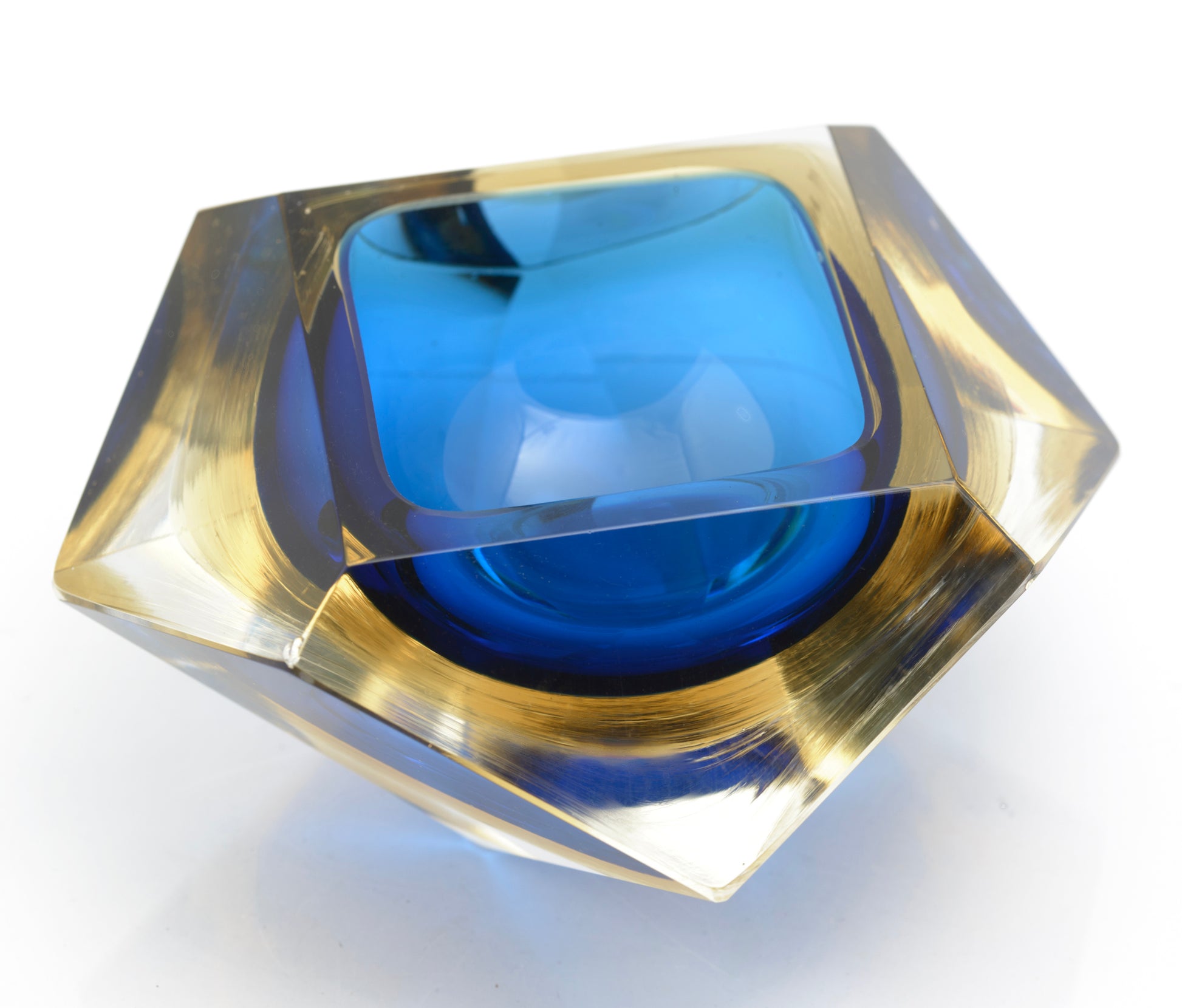A vintage Murano art glass geode bowl in the manner of Flavio Poli. It is a double cased example with blue and yellow inside the clear glass using the Sommerso technique. The sides are faceted. There are no makers marks which is normal as these items came with paper stickers originally. You can see the flow lines in the glass from production. The outer glass has some reaction to UV with a pale green glow.