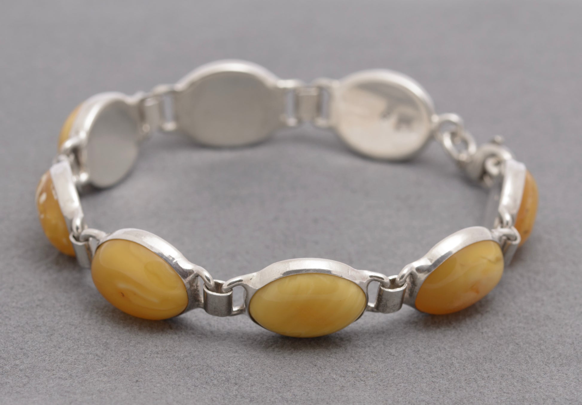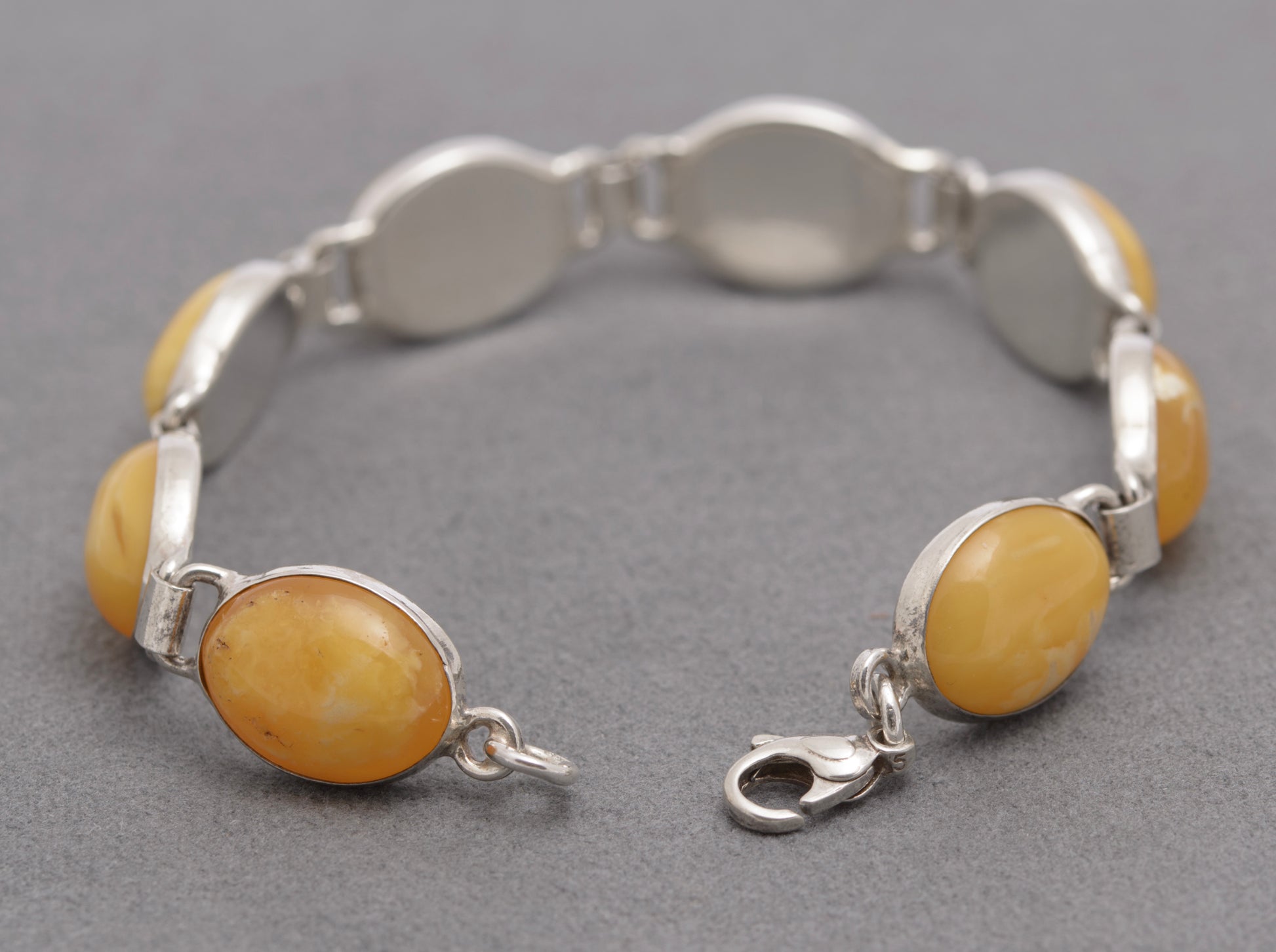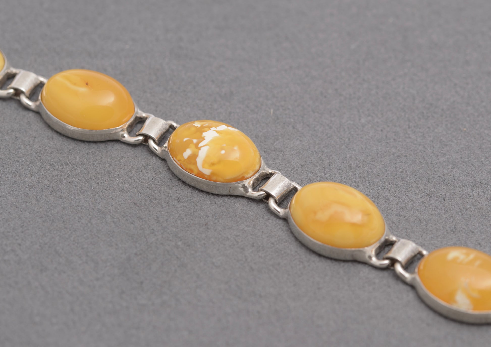 Vintage Polish Sterling Silver & Natural Egg Yolk Amber Cabochon Bracelet (B2609)