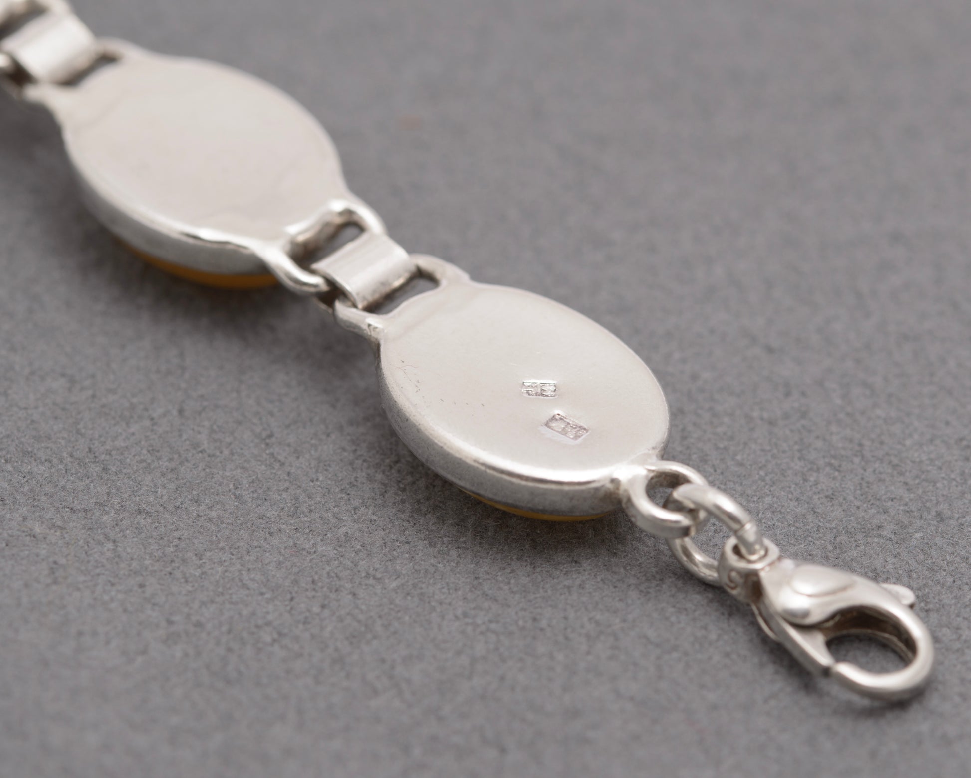 A vintage Polish sterling silver and egg yolk amber bracelet. Very pretty with lovely natural amber cabochons. Each cabochon is bezel set and articulated and it closes using a lobster clasp. To the back of one panel it has a Polish hallmark for Gdansk. The connector ring also has an official import mark with the sterling silver hallmark from the London assay office. It dates to the 1980's.