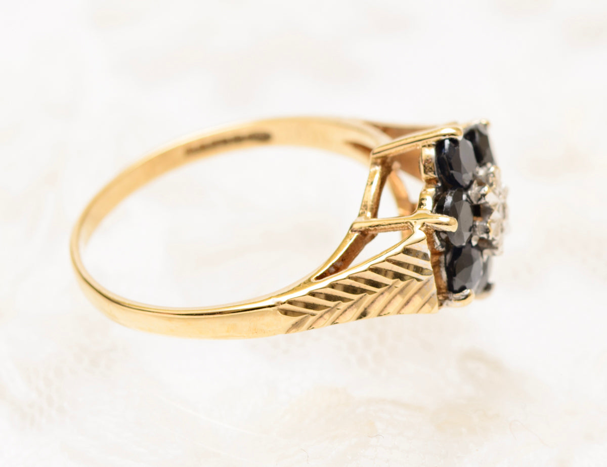 Vintage Retro Design 9ct Gold Ring Natural Sapphire & Diamond Cluster (A1831)