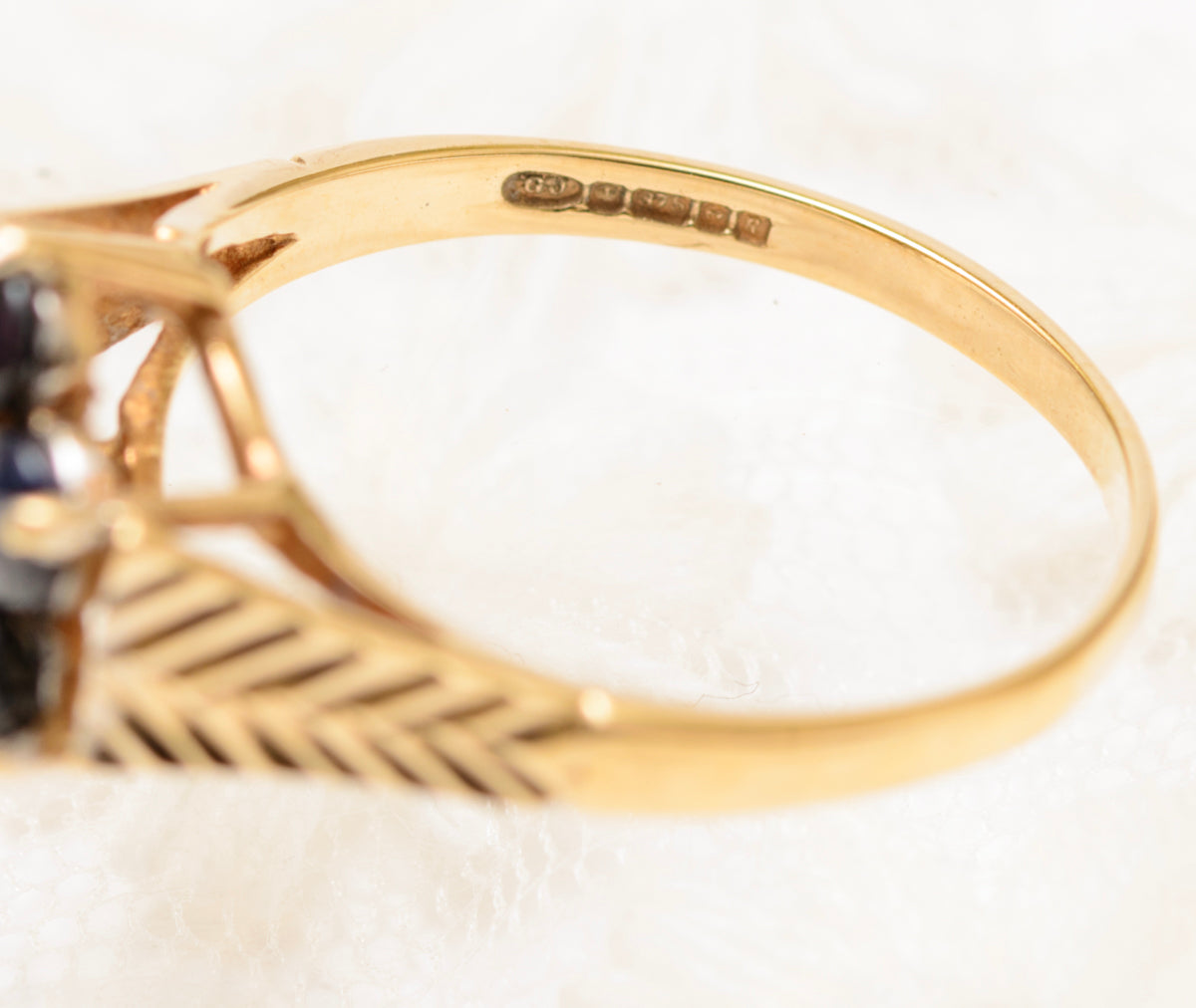 A 1990's vintage ring in the 1970's style. It is made from 9ct gold and has textured shoulders. It has a cluster of six natural sapphires surrounding a central small diamond. This style is famously atributed to the 1970's so it is quite unusual to find one from this later period. The hallmark inside the band is for the Birmingham assay office with the date letter for 1991. The makers initials are G J.