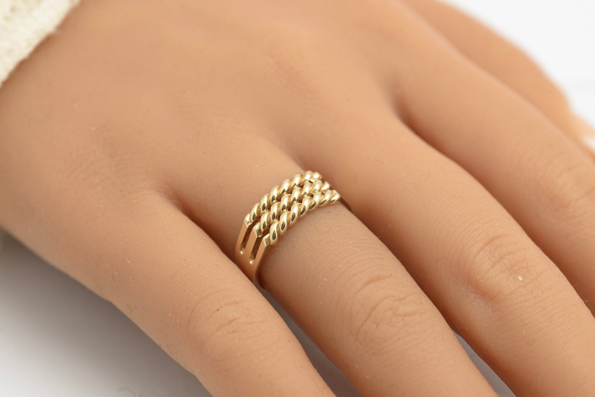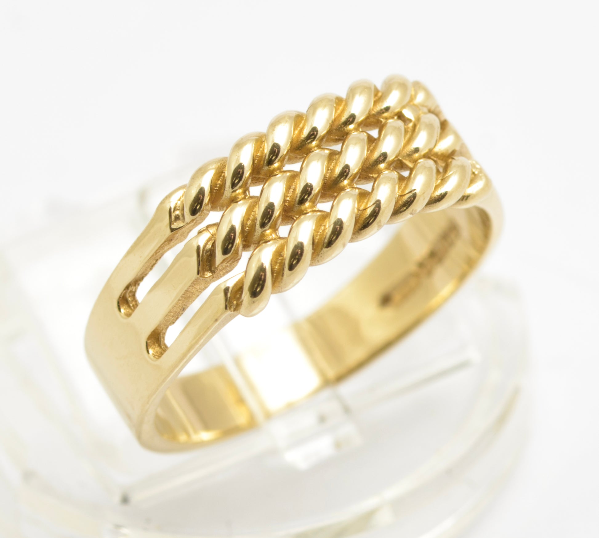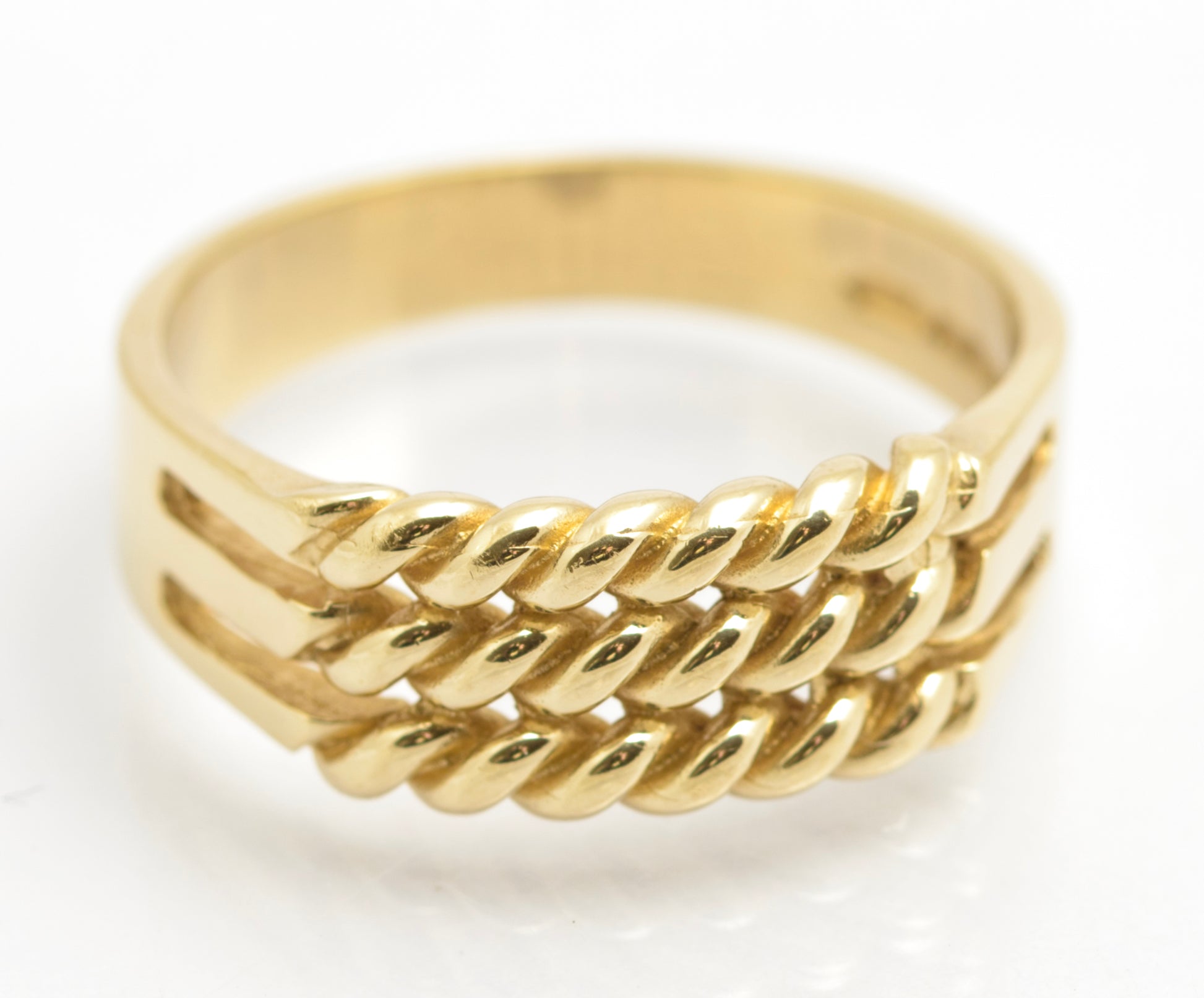 A solid 9ct gold ring in keeper style but with a rope twist three bar head. Cut out detail to the shoulders tapering to a plain band. Nicely made with an interesting look. Would suit men or women. Inside the band it has a full hallmark from the London assay office with date letter for 1994. The makers mark is I & BJ.