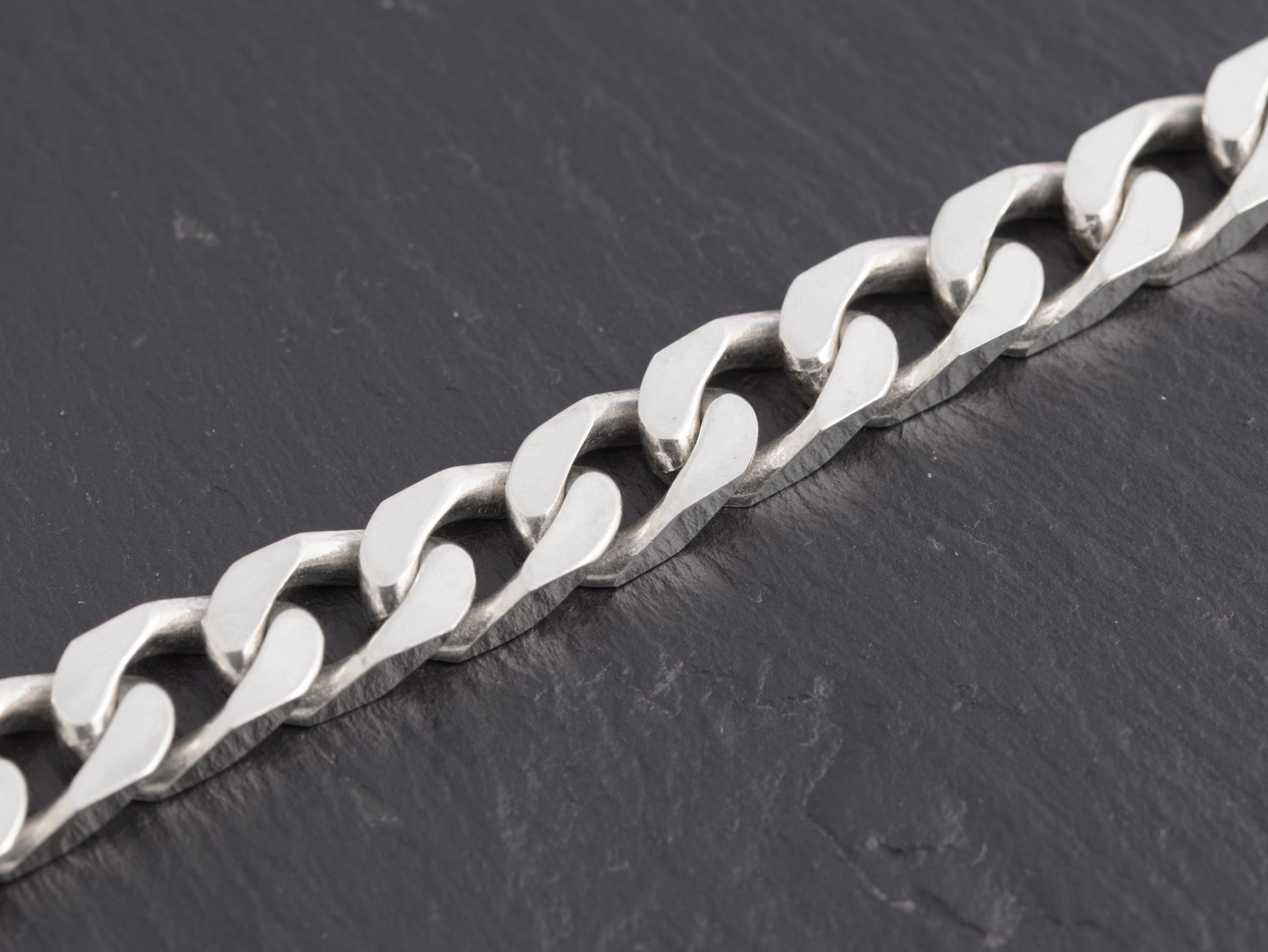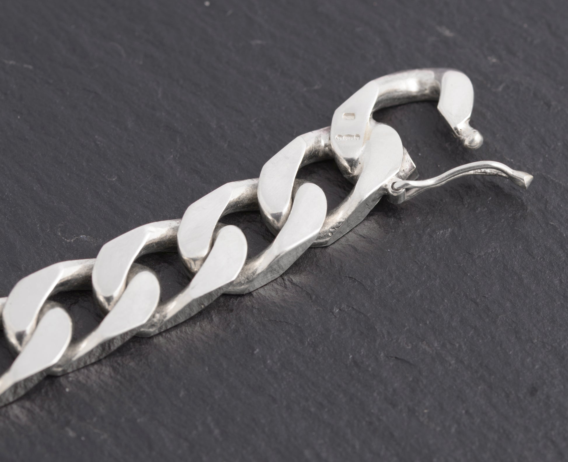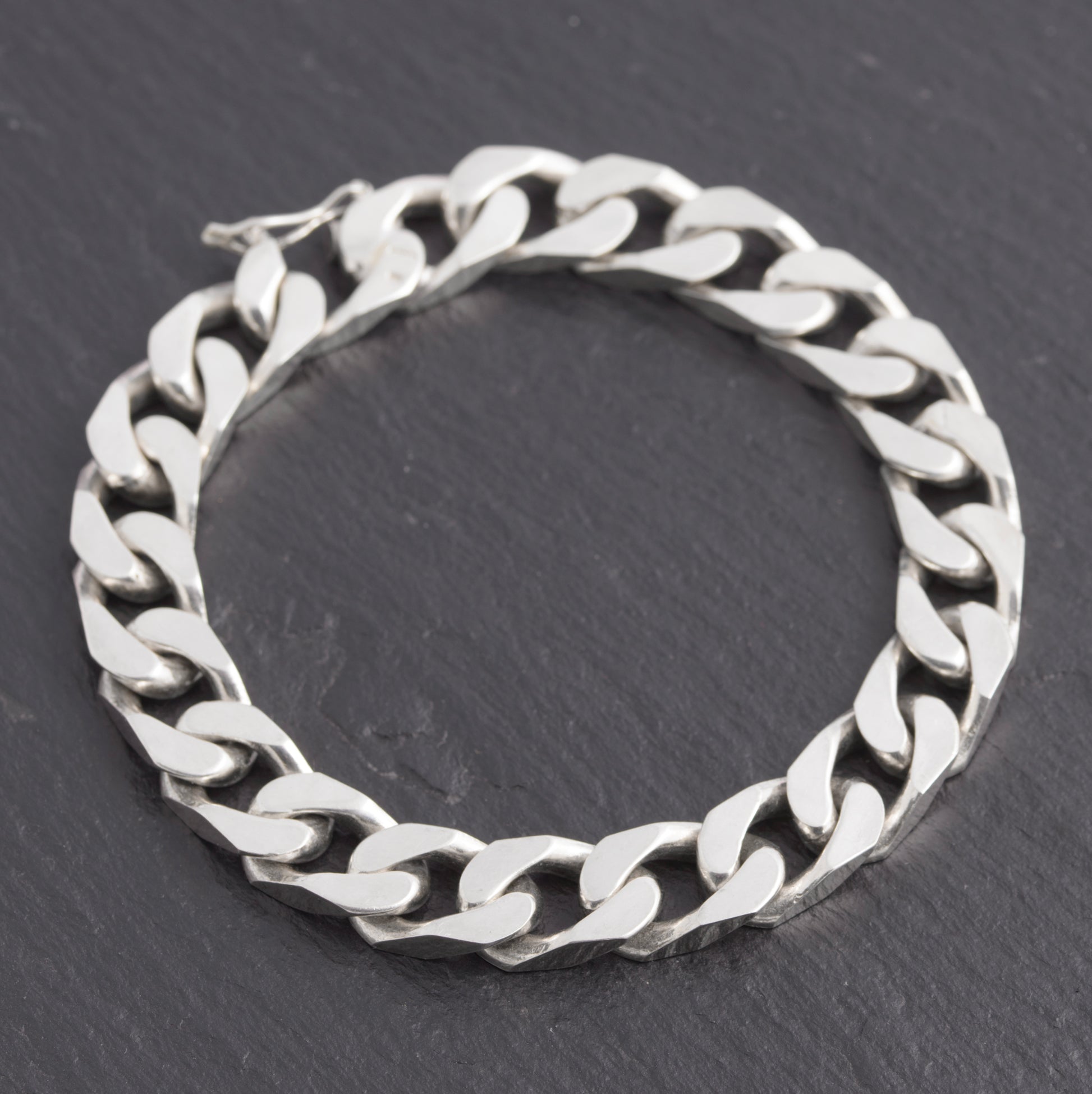 A vintage sterling silver cut curb link chain bracelet. It has a disguised link opening with latch. It has 925 mark for sterling silver and it also has an official UK import mark from the Sheffield assay office with date letter for 1981. Good chunky links and a solid feel. Unisex design but is on the larger size for a lady at 19cm wrist size.