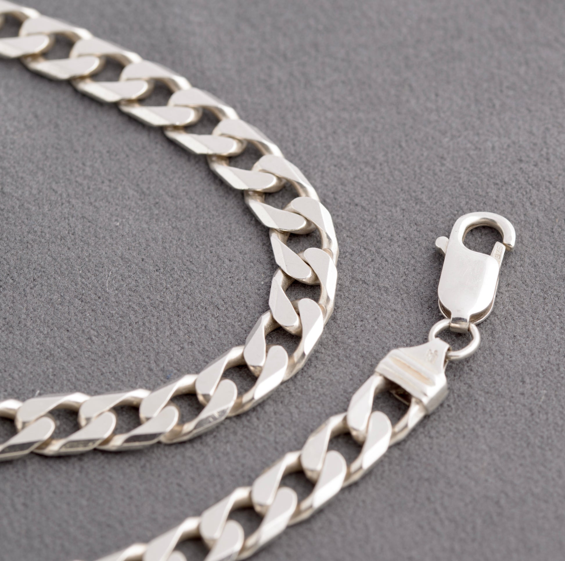 A vintage sterling silver curb chain necklace. It has chunky cut curb links and a lobster clasp closure. There are 925 marks and one terminal also has a hallmark from the Birmingham assay office using the international style of mark typical of the 1980's.