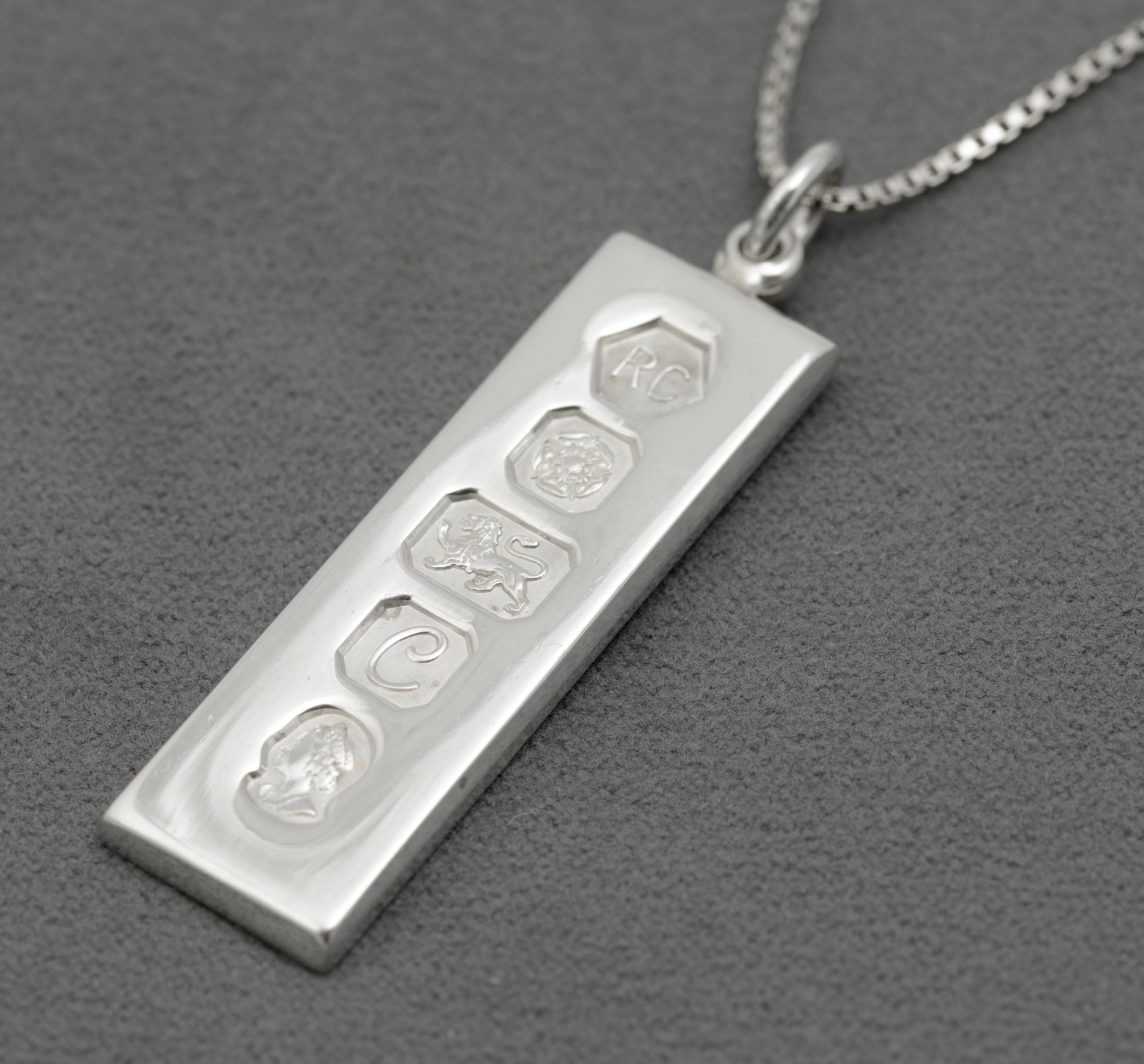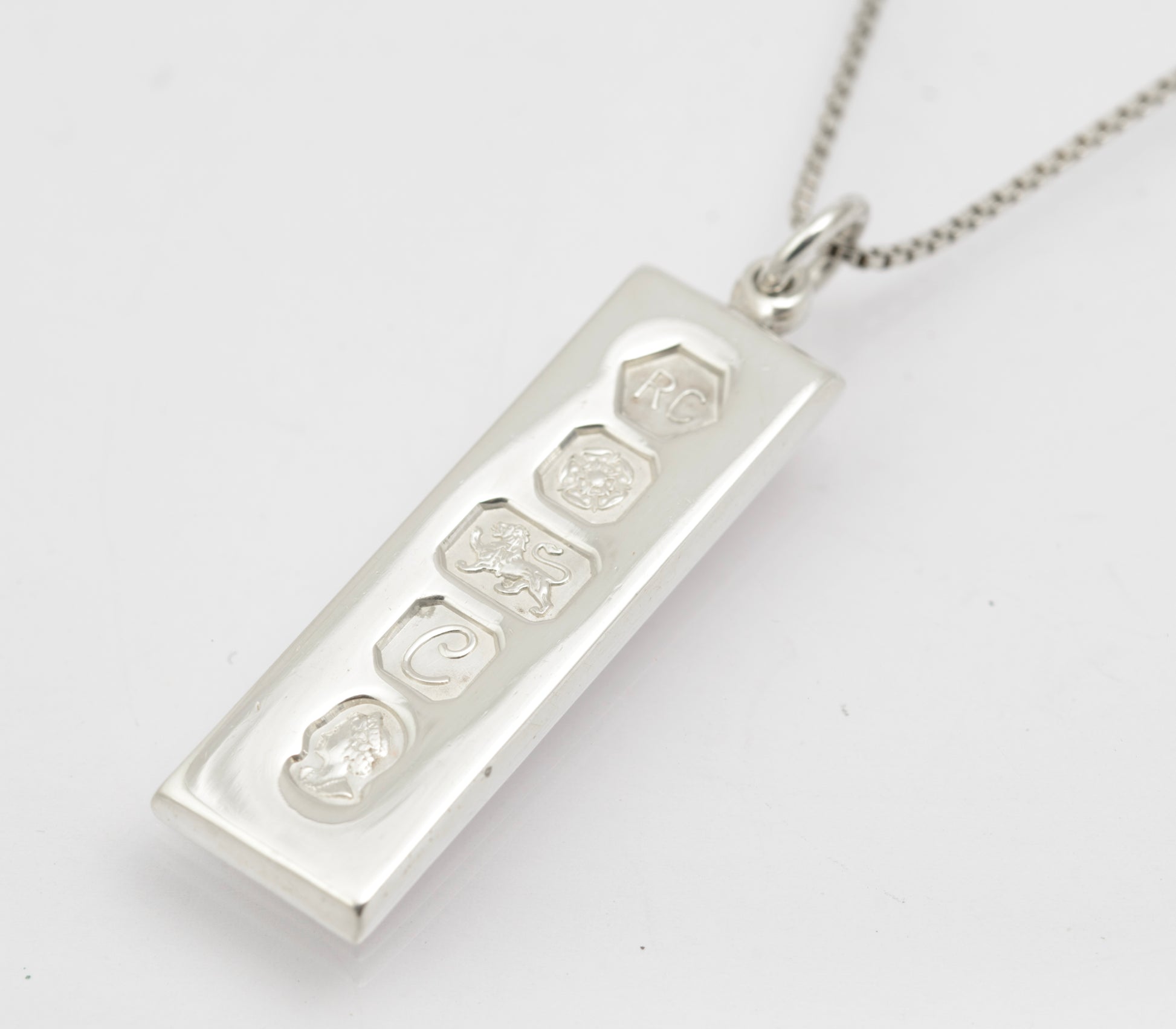 A vintage sterling silver ingot pendant on a chain necklace. It has feature hallmarks for the Queen's Silver Jubilee year in 1977. The hallmark is from the Sheffield assay office and the makers mark is for Carr's of Sheffield. It comes on a box chain which has a spring ring clasp. The chain is marked for sterling silver and is Italian made.