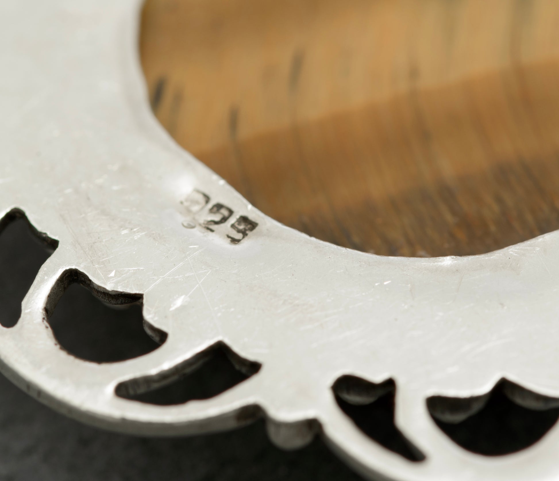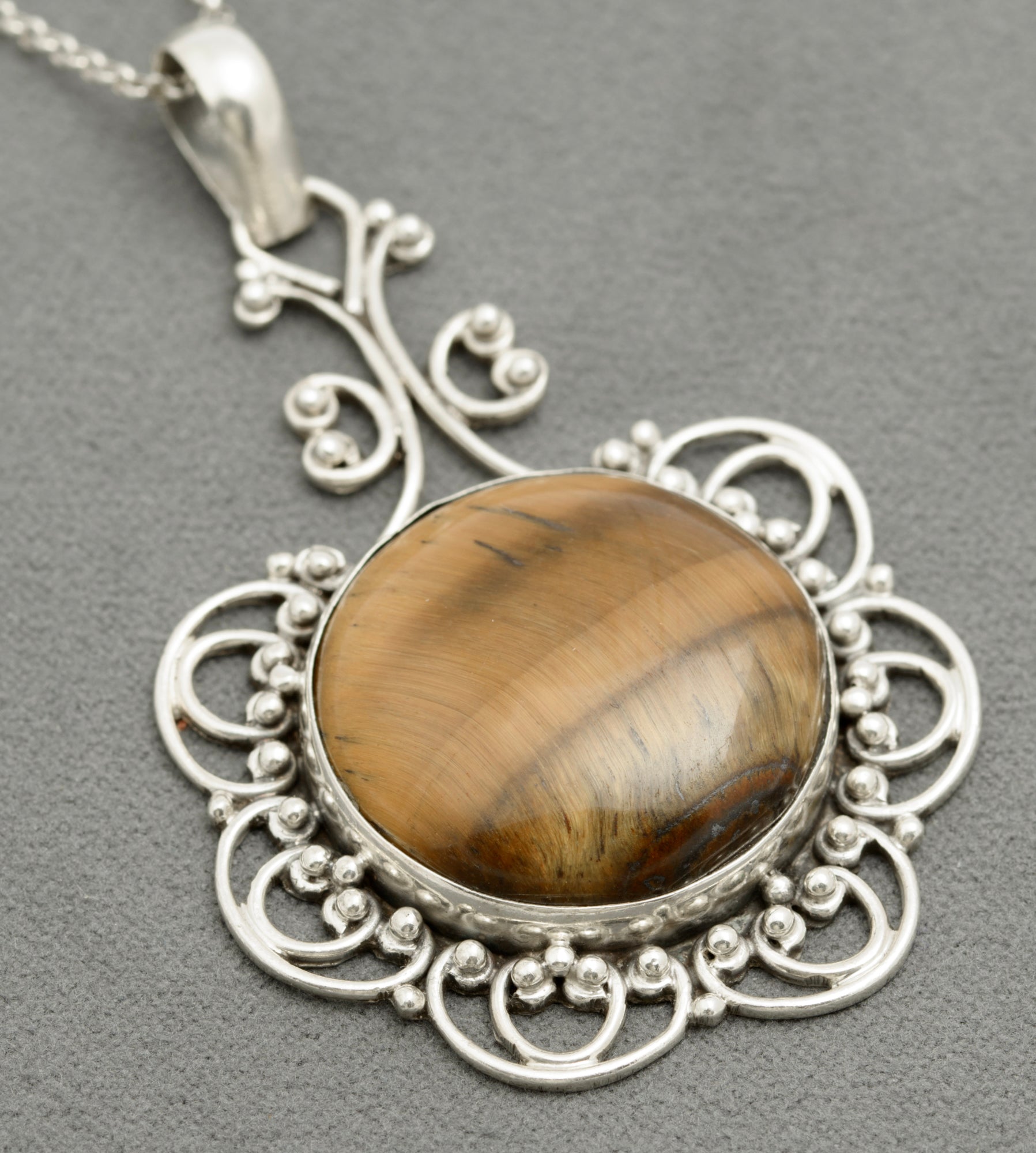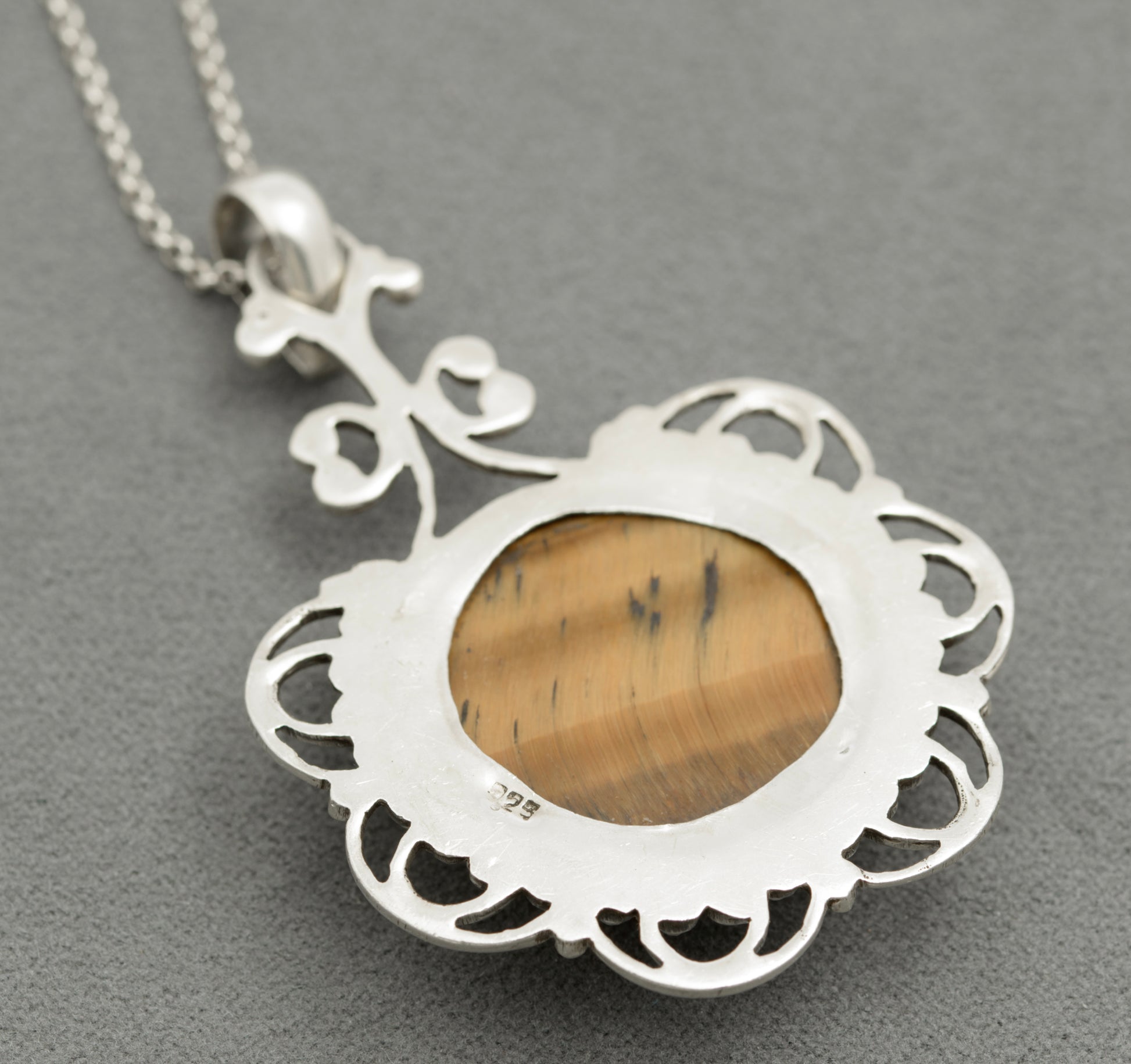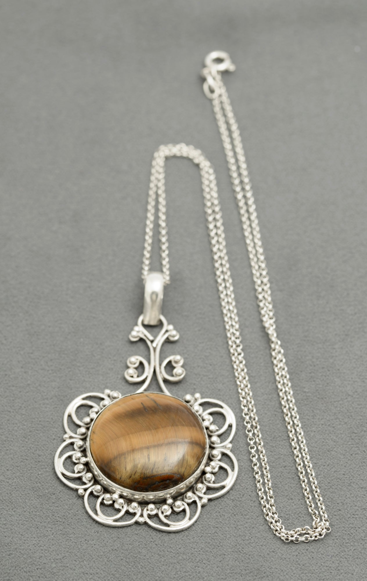 A very pretty vintage necklace in sterling silver with a tigers eye pendant. The pendant is set in a decorative mount with hooped detail and has a teardrop shaped bale. It comes with a sterling silver 1.6mm chain which has a spring ring closure. It is stamped 925 to the reverse and tests as sterling silver. The construction suggests it is hand made by an artisan type jeweller.