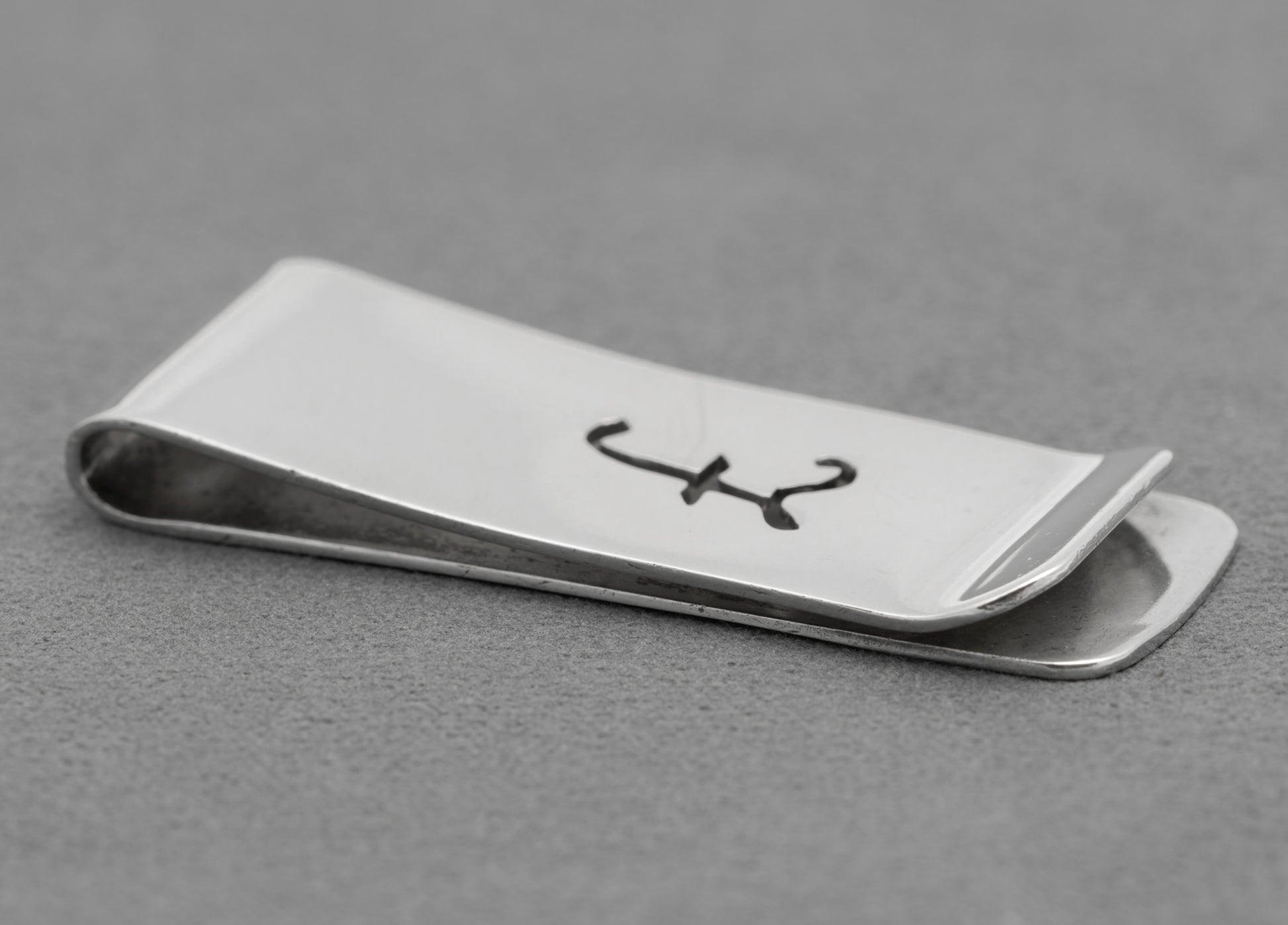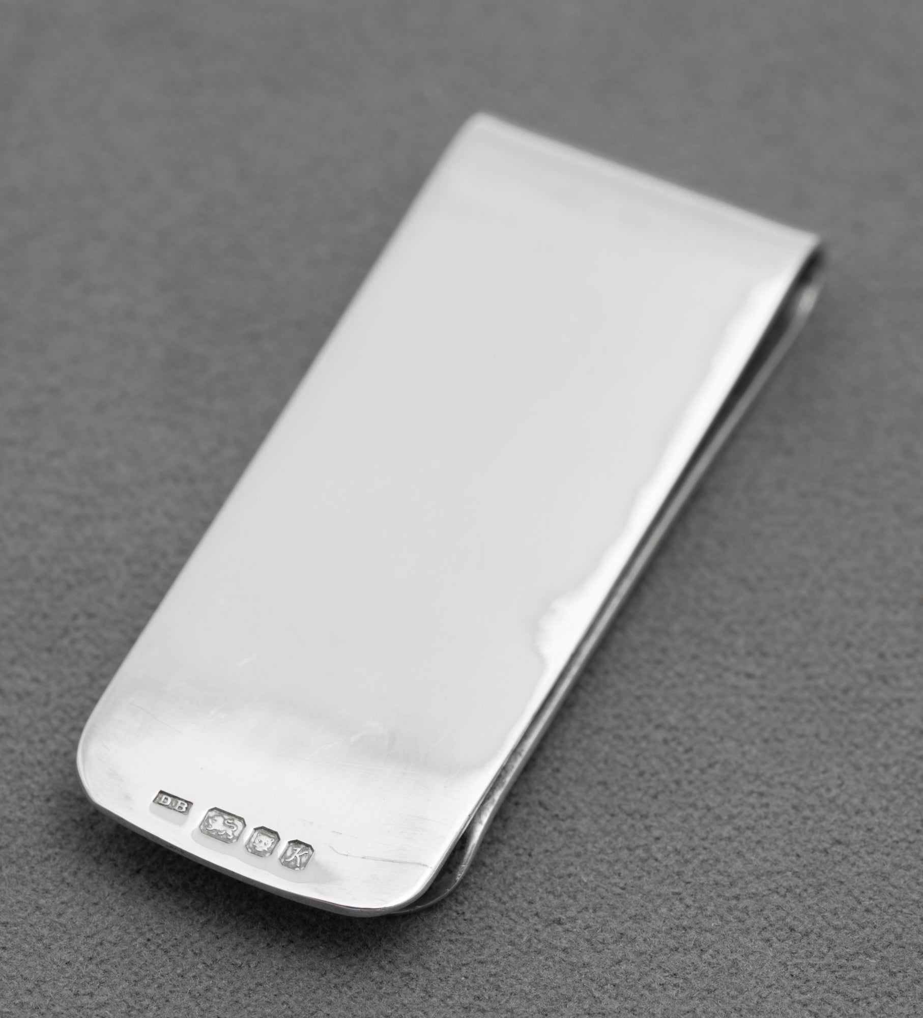 A vintage sterling silver money clip. It has a cut out in the shape of a pound sign to the front. It is made with quite thick section silver and has a nice weight in the hand. To the reverse it has hallmarks from the London assay office with date letter for 1984. It also has the makers mark DB.