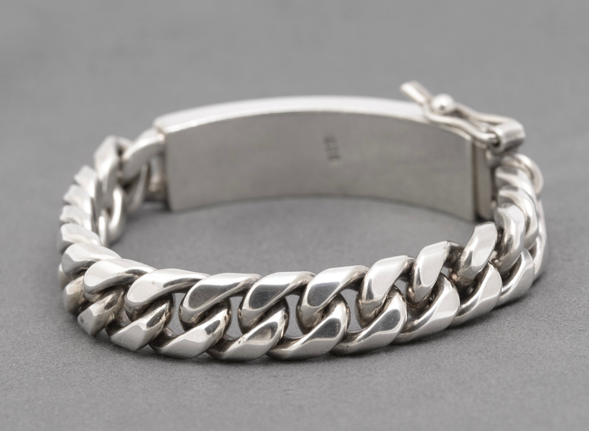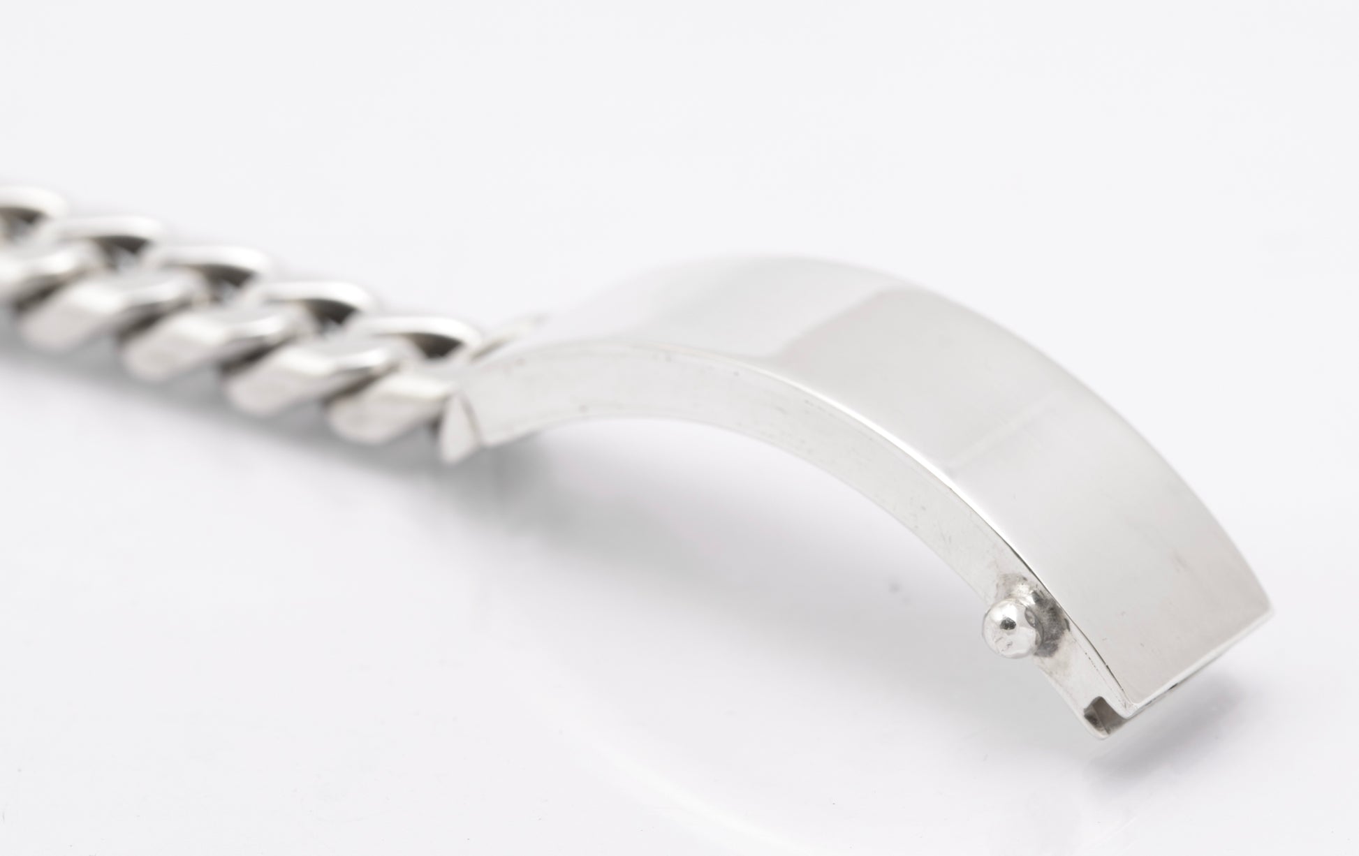 A particularly heavy and chunky vintage ID bracelet. It has a Cuban link bracelet with a large tag being some 5.4mm thick and 5cm long (curved). It has a slide clasp at one end of the ID tag with the integral safety clip. The back of the ID tag is marked 925 and also has a hallmark from the Birmingham assay office without date letter. It would date to the 1970's.