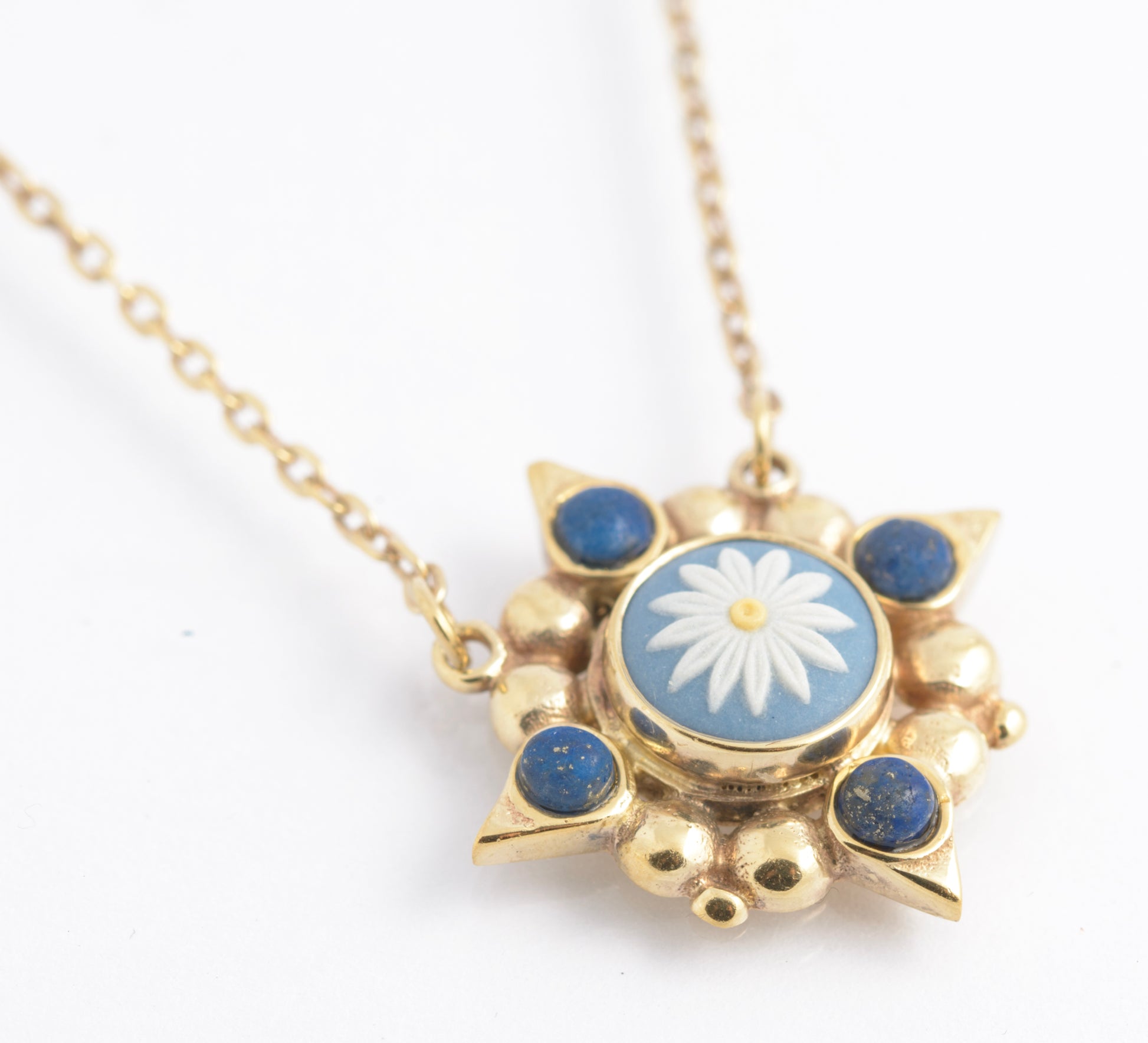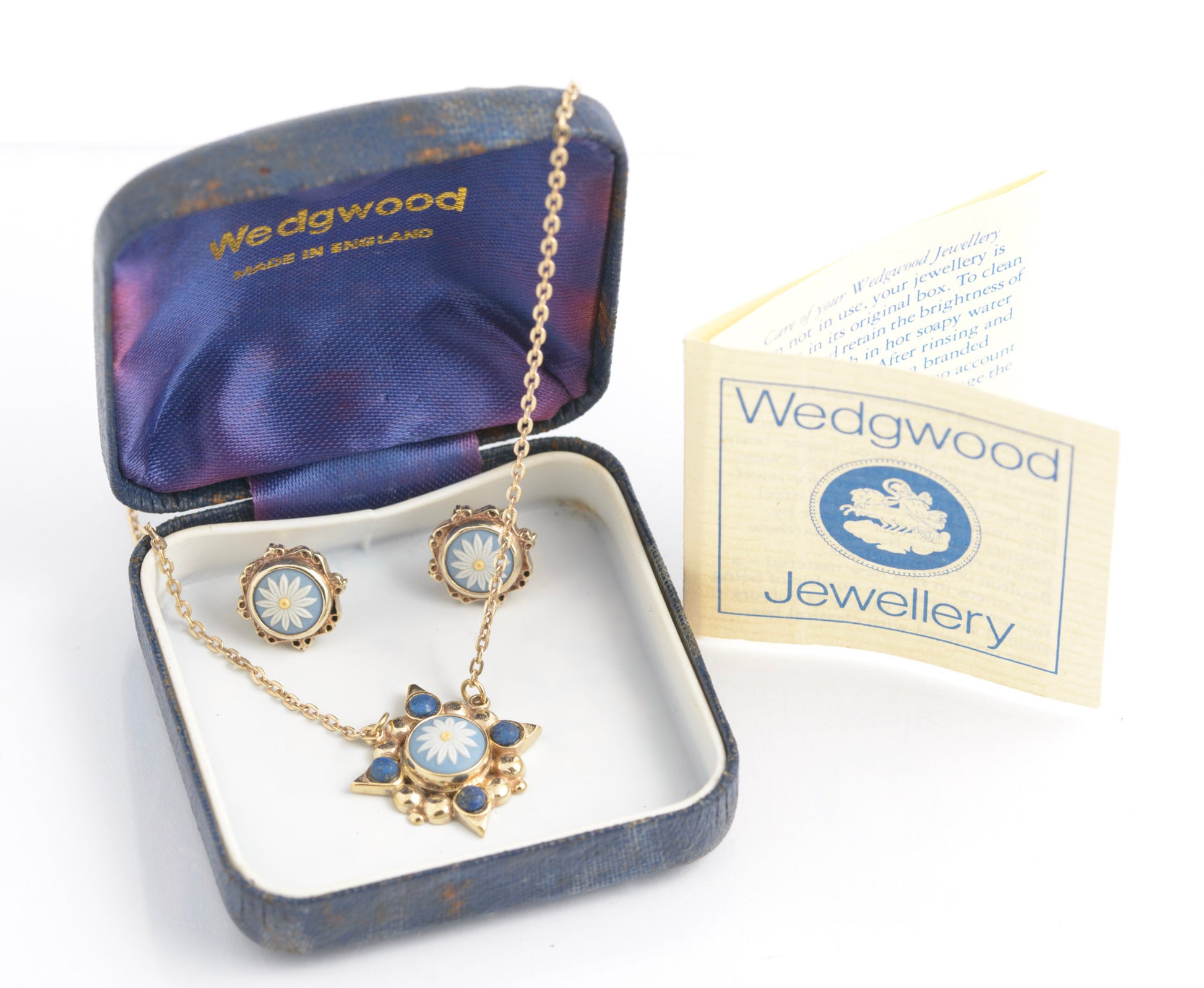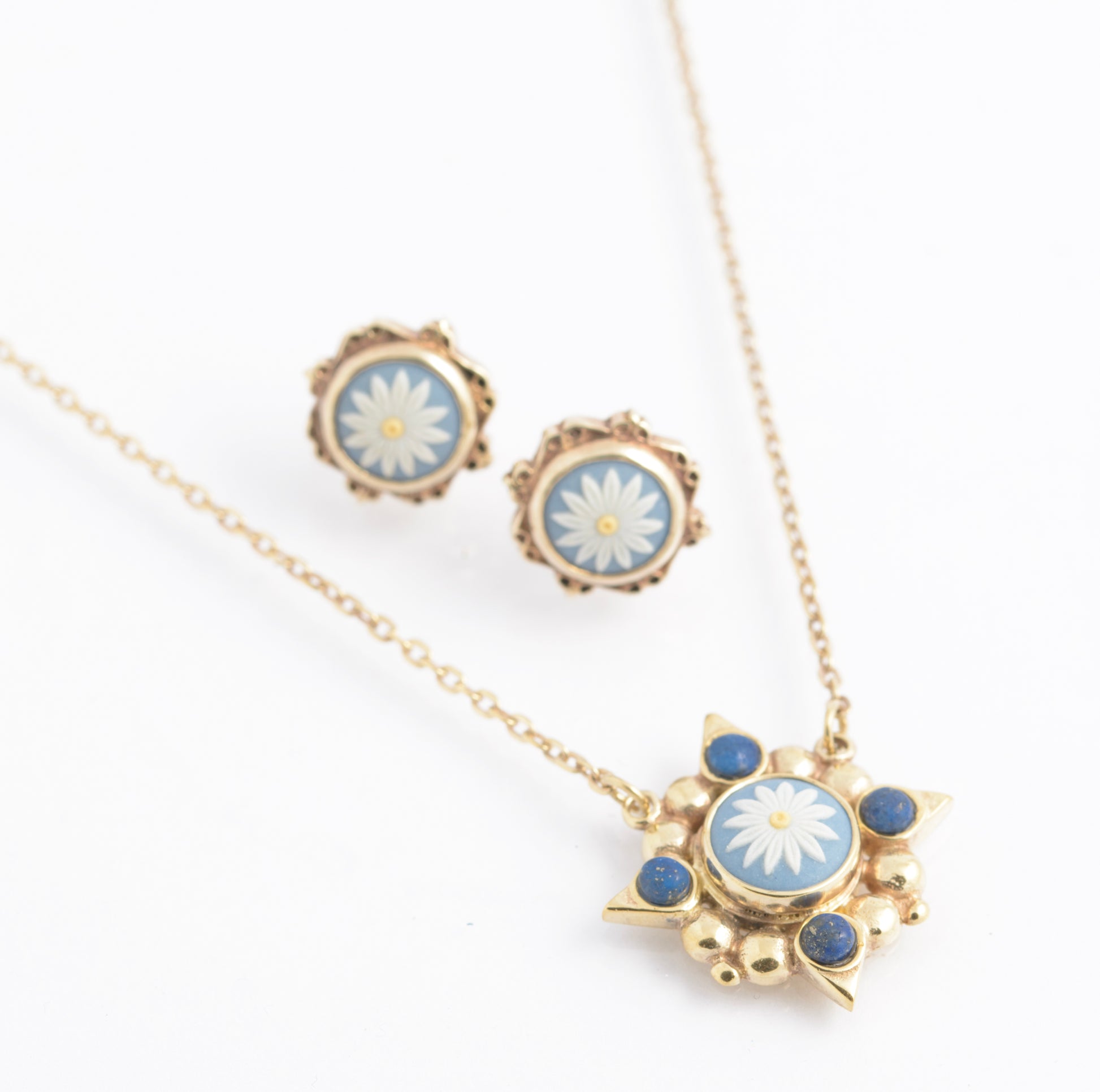 A vintage Wedgwood necklace and earrings set. Both the earrings and necklace are in sterling silver and then gilded. The centre of the pendant and the earrings has a tri colour Wedgwood jasperware flower and the pendant also has lapis cabochons. The earrings are post backs with butterflies and the pendant chain has a standard spring ring closure.